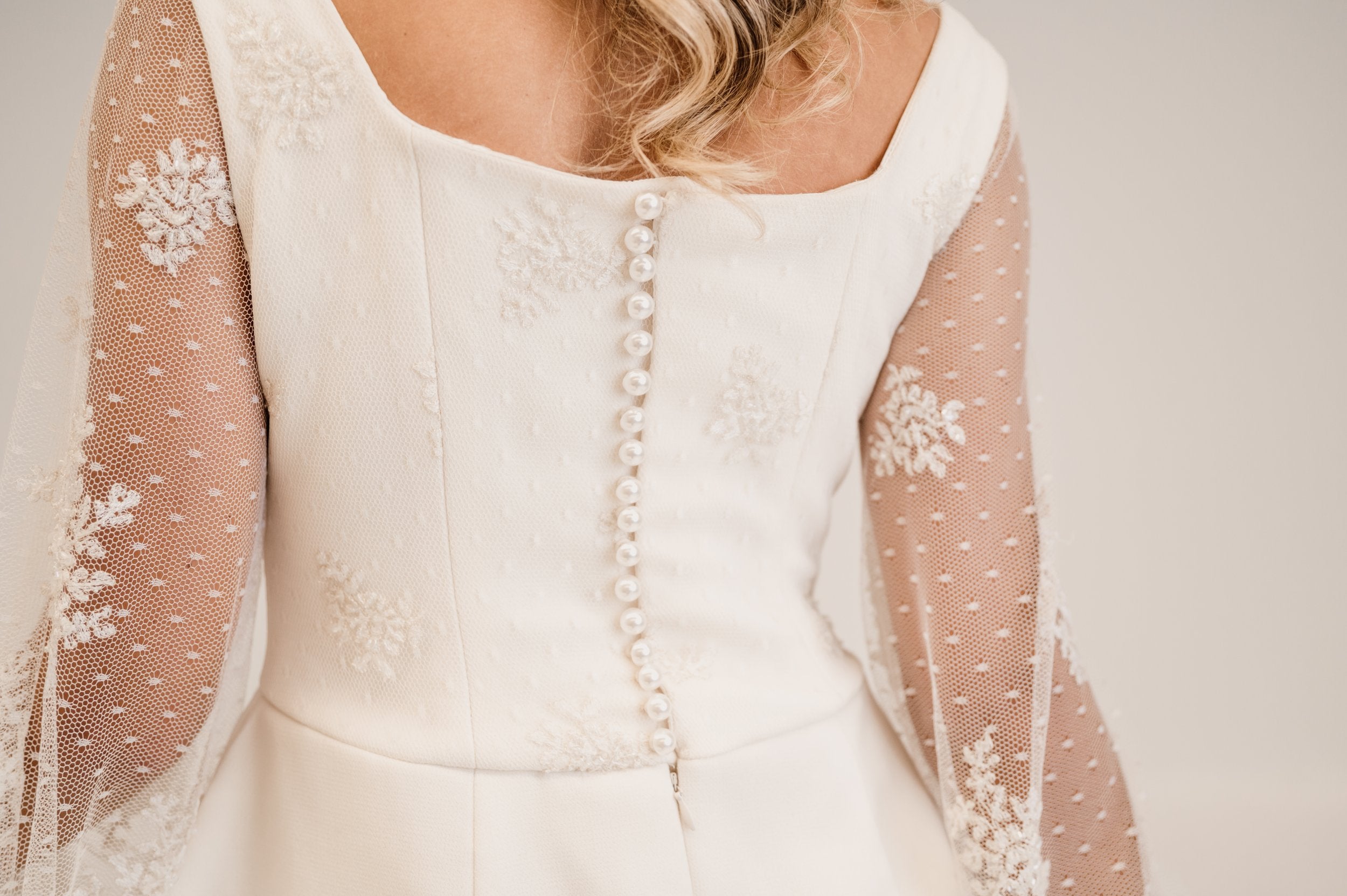 Our gowns are made to order with a 6 month production time. We recommend ordering your dress 6-8 months before your wedding to ensure sufficient time for your gown to be lovingly hand-made and delivered to you.